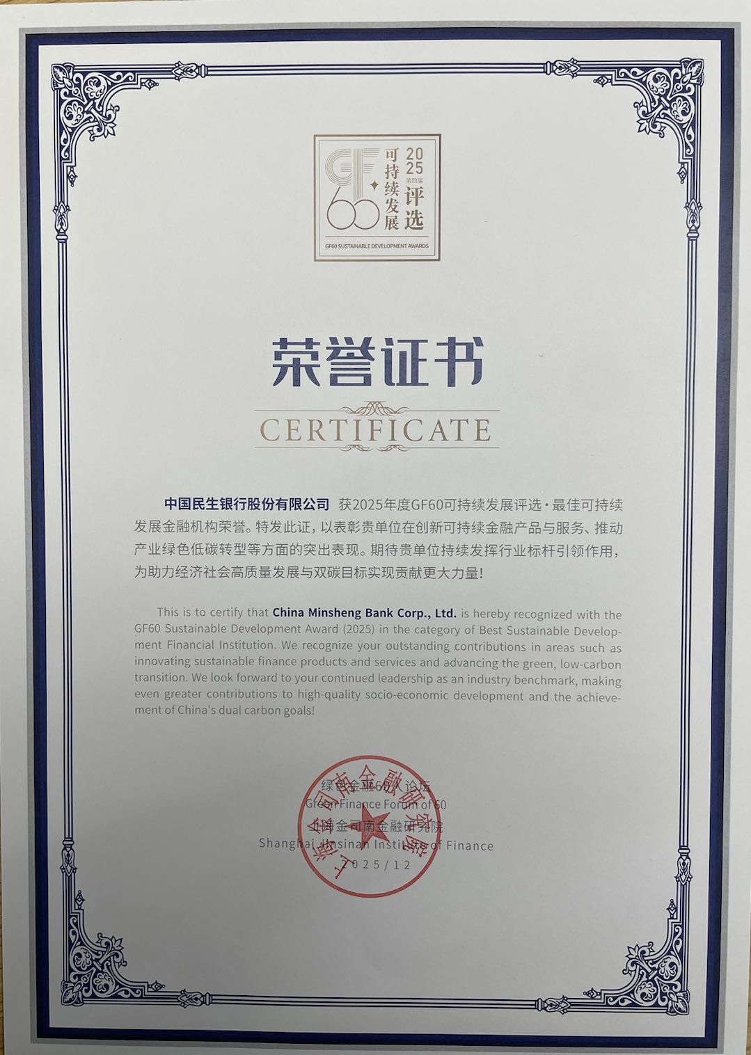 近日,由绿色金融60人论坛(GF60)主办、上海金司南金融研究院承办、中欧国际工商学院协办,以“探索绿色可持续发展新机遇,共筑国际绿色金融枢纽新篇章”为主题的2025第四届绿色金融北外滩论坛在上海虹口举办。民生银行因在创新可持续金融产品与服务、推动产业绿色低碳转型等方面的突出表现,获2025年度GF60可持续发展评选·最佳可持续发展金融机构荣誉。