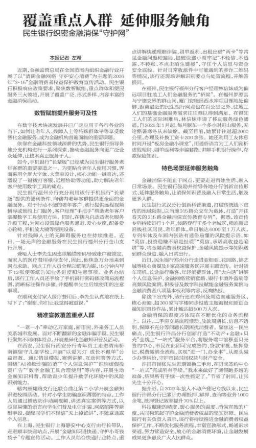 编者按:3月17日,《金融时报》刊发稿件《覆盖重点人群 延伸服务触角 民生银行织密金融消保“守护网”》,报道了民生银行2026年“3·15”金融消费者权益保护教育宣传活动情况。全文如下: